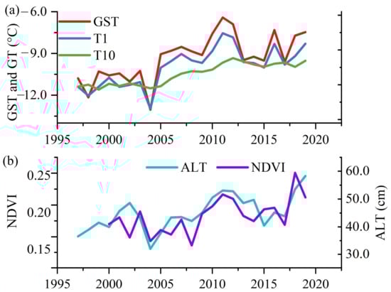 Dynamic of ground surface temperatures (GST) and ground temperatures (T1 and T10), active layer thickness (ALT) in 1997–2019 and NDVI in 2000–2020 at Saskylakh, Anabarsky District, the Sakha Republic, Russia. Notes: (a) shows the ground surface temperature at the depth of 5 cm (GST) and ground temperature at depths of 1 and 10 m (T1 and T10); (b) shows the normalized difference vegetation index (NDVI, −1~1) and active layer thickness (ALT).