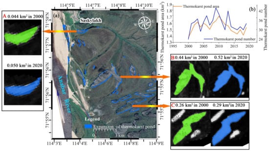 Expansion of perennial thermokarst lakes and ponds at Saskylakh, Anabarsky District, the Sakha Republic, Russia in 2000–2020 (The background Google Earth image was accessed in August 2013). Notes: (a) shows the expansion of perennial thermokarst lakes and ponds, (A), (B) and (C) are typical e expansion of perennial thermokarst lakes; (b) shows the fluctuation of thermokarst pond and number in 2000–2020.