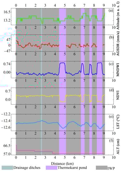 The W–E transect at Saskylakh, Anabarsky District, the Sakha Republic, Russia (the starting point of the W–E Transect is 0.0 km from the W–E Transect in Figure 2); Notes: (a) is the altitude (m a. s. l); (b) is the annual ground surface deformation rate (AGSDR, mm/a); (c) is the modified normalized difference water index (MNDWI, −1~1). For thermokarst pond: MNDWI > 0; (d) is the normalized difference vegetation index (NDVI, −1~1); (e) is the land surface temperature (LST, °C); and (f) is the active layer thickness (ALT, cm).