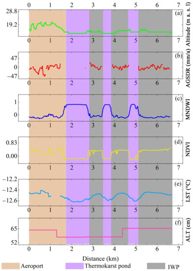 (2) W–E direction transect (Figure 9). This is a 6.8 km-long W–E direction transect traversing across the study area and passing through the Saskylakh Aeroport (at the distance of 0.0~1.7 km), IWP (at the distance of 2.8~3.5, 3.9~4.7, and 5.2~6.8 km), and thermokarst lakes and ponds (at the distance of 1.7~2.8, 3.5~3.9, and 4.7~5.2 km).