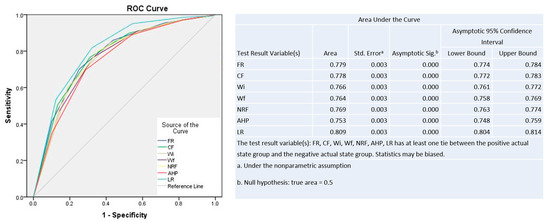 Based on weight calculated in Table 3 for elevation, area with <300 m obtained FR = 1.521, and = 0.419 had the greatest effect on fire occurrence while 600–900 m elevation were predicted highly susceptible according to NRF = 1.873 and AHP = 0.536. The CF model ranked higher elevation class (>1200 m) to be highly prone to forest fire occurrence. The models did not show any specific pattern of ranking variable class towards forest fire susceptibility. However, elevation with = 100 indicates the importance of elevation towards occurrence of forest fire. Aspect analysis shows area with West and South west (W + SW) orientations are highly prone to forest fire with FR = 1.189, CF = 0.159, = 0.173, and AHP = 0.498. NRF calculated the highest weights for North-west (NW) orientation is 1.955 followed by W + SW with NRF = 1.236. Slope angle with increasing slope fire susceptibility increases but area with >30°, steep slope, is negatively correlated with fire susceptibility. Slope from 20° to 30° are calculated with highest weights: FR = 3.532, CF = 0.718, = 1.262, and AHP = 0.469. The LR model predicted that elevation is negatively related while slope and aspect are positively related to forest fire occurrence. The climatic variables including temperature, precipitation, solar radiation and wind speed do not define any specific trend with the weights calculated, but the LR values show positive relationship between solar radiation and negative with wind speed. The areas with temperature <29 °C, the highest precipitation (>150 mm), solar radiation of 19,000–20,000 kJm−2day−1, and moderate wind speed of 1.4–1.5 ms−1 show higher susceptibility to forest fire. Similarly, LST day with moderate temperature class and LST night with the highest temperature are predicted to be highly contributing to forest fire. Mixed deciduous type is predicted to be highly susceptible to forest fire, followed by semi-evergreen and plantation patches. The climate variables contribute to forest fire occurrence, but key determinants are vegetation [2] and topography [8]. LAI value with 1–2 shows higher susceptibility to forest fire, possibly due to distribution of maximum forest patches within the class in the study area. According to LR model, NDVI shows higher positive relationship with forest fire, while NDWI has negative relationship and similar trend is observed through other five models. Increasing NDVI indicates high susceptibility to forest fire, while inverse relation is showed by NDWI. While TWI also shows an inverse relation with forest fire occurrence, a lower TWI value has a higher chance of fire occurrence and vice-versa, but a positive relationship is predicted according to LR model. Distance from road, rail and settlement show higher forest fire susceptibility with higher Euclidean distance classes and lower for lower distance. This is anticipated that the accessibility of fire-fighting equipment would be related to these two factors since it is frequently transported to the scene by road or rail [12,15]. As a forest patch loses moisture, the susceptibility to forest fire increases with increasing distance from water sources. However, the results of the LR model show that distance from a road, a settlement, and a body of water are all positively related, whereas distance from a railroad is negatively related.