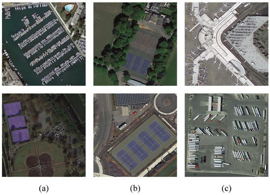 Instances from a bird’s-eye view. The images are from the DOTA dataset. There are challenges and difficulties in detecting remote sensing images. (a) Small and densely packed objects. (b) Objects with complicated backgrounds. (c) Objects with arbitrary orientation.