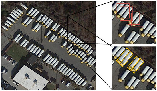Object detection is a crucial task in remote sensing image processing with numerous practical applications. Its purpose [1] is to locate each object within an image and identify its category. As more aerial images become available, researchers are increasingly focusing on object detection in aerial images [2,3,4,5,6]. Aerial images are typically acquired from a bird’s-eye view, resulting in complicated object orientations, as seen in Figure 1. Therefore, it is challenging to accurately locate and identify the objects of interest in an aerial image.