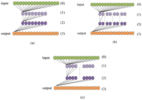 The schematic map of complexity on channels. (a) stands for ResNet. (b) stands for ResNeXt (4 × 2). (c) stands for ResNeXt (2 × 4). The green circles represent the input features whose number represents the number of channels about features. The yellow circles represent the output features. The purple circles represent the middle features.