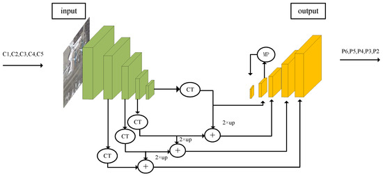 Figure 7 illustrates the bottom-up feature extraction and top-down feature fusion structure of FPN. FPN combines features of different spatial sizes through upsampling and fusion. The backbone generates feature maps C1, C2, C3, C4, and C5. The features from C2 to C5 are fused to create feature maps P2, P3, P4, and P5. P6 is obtained by applying a 3 × 3 convolution with a stride of 2 to P5. The features from high levels have larger receptive fields, making them more suitable for detecting larger objects. The features from lower levels, such as P3 and P4, are more efficient in detecting smaller objects with lower resolution. Under such a structure, we usually achieve good detection performance, especially in remote sensing image detection.