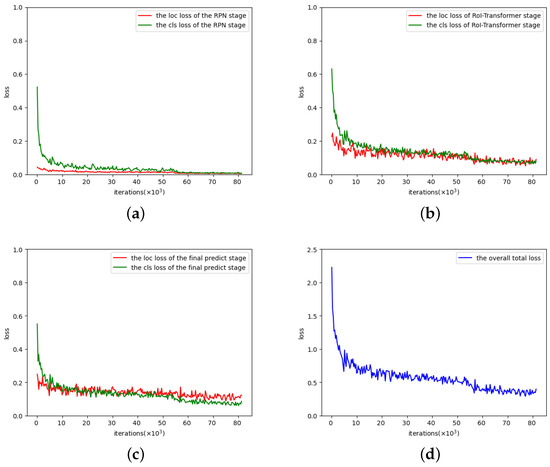 Figure 10d shows the blue curve, representing the overall total loss, which aggregates all losses including both loc and cls losses of all three RPN, RoI-Transformer, and final predict stages during training. As the iterations increase, the overall total loss rapidly decreases and becomes almost flat with little fluctuation. This indicates that the minimizing the overall total loss procedure is successfully completed, and the corresponding optimal model parameters are acquired by training, making our method trainable and stable. A similar description applies to Figure 10a–c, where the loc and cls losses correspond to RPN, RoI-Transformer, and final predict stages, respectively, instead of the overall sense as in Figure 10d.