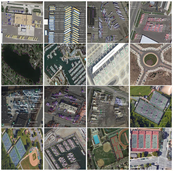 - Datasets: The DOTA [38] dataset is a public open-access dataset for object detection in aerial images at large scales. It provides two kinds of annotations for oriented and horizontal bounding boxes, respectively. The aerial images of DOTA are collected from Google Earth and satellites, including Julang-1(JL-1) and GF-2. DOTA contains 2806 aerial images. It consists of a training set (1411 images), validation set (458 images), and testing set (937 images). The sizes of the images change from 800 × 800 pixels to 4000 × 4000 pixels. There are 188,282 instances including plane (PL), basketball diamond (BD), bridge (BR), ground field track (GFT), small vehicle (SV), large vehicle (LV), ship (SH), tennis court (TC), basketball court (BC), storage tank (ST), soccer ball field (SBF), roundabout (RA), harbor (HA), swimming pool (SP), and helicopter (HC), 15 categories in total.