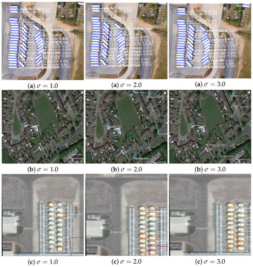Figure 12 shows the visualization of object detection with different scale factors . The left, middle, and right columns correspond to values of 1.0, 2.0, and 3.0, respectively. The detection results in the middle and right columns are more effective than those in the left column. For instance, in Figure 12a (), the rotated bounding boxes do not fit the objects very well. In contrast, in Figure 12a () and (), the rotated bounding boxes fit the objects better. Similar observations are applicable to the detection results displayed in Figure 12c. For the detection results shown in the middle row (i.e., Figure 12b), we can see that more small objects are successfully detected with and , while some small objects cannot be detected with .