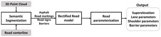 The purpose of this work is to analyze an automated method for road inventory of a 3D point cloud acquired with a low-cost MMS. This method includes the road width, the number and width of individual lanes, the superelevation, the width of the pavement shoulders, and the barrier height when present. Previous works have proposed various methodologies for road inventory: Holgado-Barco et al. proposed a heuristic method based on the segmentation, classification, and extraction of road markings through intensity thresholding and clustering of discontinuous road lines [12]. Then, an estimation of road parameters, except for barrier height, is performed using PCA and specific thresholds. However, it did not use the road centerline and was limited to highway study cases. Vidal et al. [14] performed segmentation and classification of barrier types on 3D point clouds using an intensity threshold to isolate road markings and fit a plane to the road. Then, a DBSCAN clustering allows distinguishing barriers among non-ground points. However, it focuses on security barriers and does not use more complex semantic segmentation applied to different objects. Regarding road tilt, Gargoum et al. performed a detailed estimation of superelevation for water drainage and roadside slopes on road cross sections of an Alaskan highway [15].