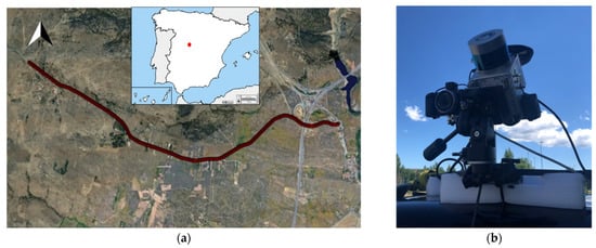 (a) Trajectory of the case study, a 6 km stretch of a road located in Ávila, Spain (red dot in map); (b) Ad-hoc mobile mapping system (MMS).