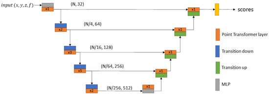Point Transformer is an architecture introduced by Zhao et al. [17]. Supported by this architecture, we designed a deep learning model composed of fives encoders and five decoders, consisting of a variable number of Point Transformer layers followed by a transition down and, respectively, up layer, as represented in Figure 4. Points are grouped through k-nearest neighbors pooling to reduce the cardinality of points by a factor of 4 at each stage of the architecture.