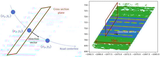 The direction vector , as a normal vector, and the point also define the road cross-section plane , visible in Figure 5. The points in the points cloud are then extracted based on a threshold distance to the cross-section plane and a distance to the origin of the vector, which were experimentally chosen as 2.5 m and 20 m, respectively. The distance to the plane is defined as (Equation (4)):