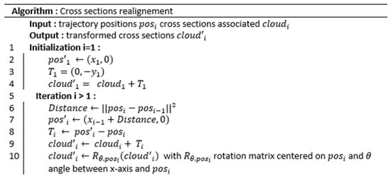 Pseudo-code for the algorithm to build a whole rectified model of a curved road from the alignment of each cross section and the road centerline.