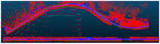 Semantic segmentation: The road dataset corresponds to a round-trip MMS acquisition to ensure equal density on both sides of the road. Due to the high density in some areas, the point cloud is subsampled with a distance criterion of 3 cm, which results in a dataset of 103 M points. Ground truth data were obtained by manual labeling for the deep learning training. The labeled dataset consists of 3 M points for training and 3.5 M for the test set after subsampling to ensure enough representative data in both of them. The training and test sets are divided into five classes: asphalt, road markings, road signs, barriers, and other, see Figure 3. The class “others” is defined with all the points that do not belong to the other classes to be segmented. Logically, and considering each class defined, we can see that the dataset is unbalanced towards the classes “asphalt” and “other”, which each account for 47% of the manually labeled points in the training set, as shown in Table 1.