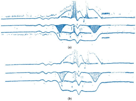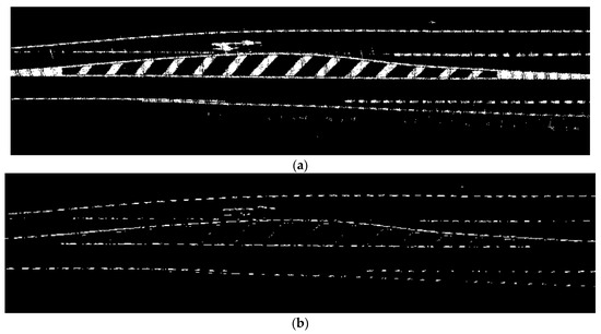 Planimetric view of the points classified as road markings along the 1.5 km rectified road model points cloud: (a) original and (b) after the application of a Sobel filter to discard vertical and diagonal edges and points outside of the road edges.