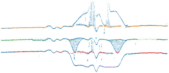 Planimetric view of the points classified as road markings and clustered by the extraction of lines based on RANSAC (left road marking in orange, center road marking in green, right road marking in red, and additional lane in purple).