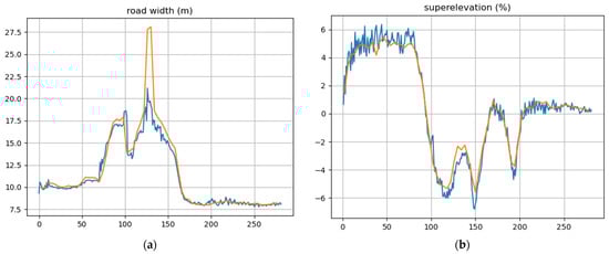 Qualitative analysis of the results for the different road parameters estimated (blue line) and manually measured by an expert (orange line), when available. (a) Road width. (b) Superelevation. (c) Left shoulder width. (d) Right shoulder width. (e) Lanes number. (f) Barrier height. (g) Lanes width.