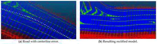 In accordance with the results obtained, there are different error sources than can be discussed here. First, the road rectification process takes as reference the extraction of the road centerline. However, this reference centerline contains errors that result in erroneous translations of the cross sections, visible by apparent undulations when displaying the rectified road model. Figure 18a shows the road alignment computed over a subset of points and the resulting road model with a local curb, visible in Figure 18b, that can affect the rest of the process.