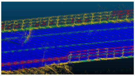 CRF post-processing: experiments showed that the performance of the CRF post-processing increased the mIoU by 0.3. The new values are shown in Table 4 and values in parenthesis indicate the difference without CRF post-processing. Qualitatively, the CRF smooths the classification, hence reducing the classification noise characterized by points isolated from their neighbors when considering their class, as represented in Figure 16. Comparing with similar works in the literature, this work outperforms results from [32] in road surface and guardrail segmentation, or results from [33] in road and traffic sign segmentation.