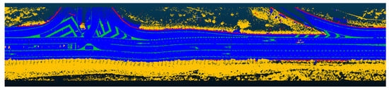 The last part of the method focuses on the calculation of barrier height as seen in Figure 15. Using the classified asphalt points based on the deep learning model defined in Section 2, a plane whose equation is can be fitted to the road with the least squares method. For its part, using the classified barrier points based on the deep learning model defined in Section 2, the barrier height can be computed as the perpendicular distance from the road plane to the barrier. Similar to the road markings, RANSAC allows to extract the line that best fits with the superior part of the barrier and cluster each barrier independently, since the number and height of barriers for each cross section could vary. The 0.95 percentile value along the Z-axis is retained as the security barrier height cluster.