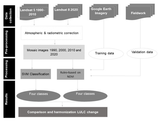 In this study we employed an SVM approach, a common and powerful method, to distinguish four vegetation classes, and an evidence-developed method, here named as a “rules-based classification”, with four seasons defined by a Normalized Difference Vegetation Index (NDVI; Figure 2). Data analysis comprised a compilation of remote sensing imagery and fieldwork, followed by image processing, a comparison of both approaches, and the harmonization of the classifications.