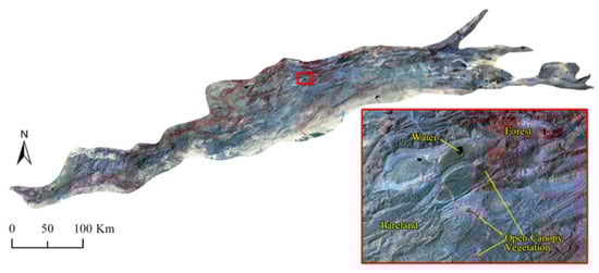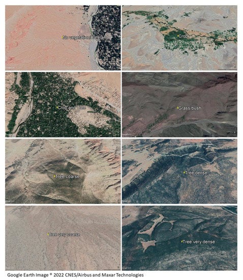 Field dataset: The first of the four vegetation classes, referred to as “Open Canopy Vegetation”, represented agricultural lands, grasslands, and tundra. The second class, referred to as “Water”, represented artificial lakes, rivers, dams, streams, and reservoirs. The third class, “Forest”, included woody and other wild vegetation, while “Bareland” referred to sand dunes, exposed rocks, deserts, and uncultivated areas (Figure 3). Those classes derived from separation [] after inspecting them using Google Earth 7.1.