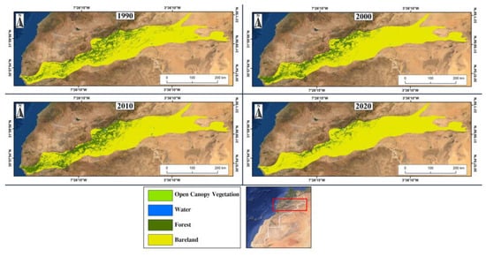 The results of the classification showed that the High Atlas is largely characterized by Bareland, followed by Forest, Open Canopy Vegetation, and Water. The latter accounted for <0.5% throughout the studied periods. Accuracy assessments obtained through the validation process of the land-use classification and the overall accuracy and Kappa coefficient were satisfactory (Table 3).