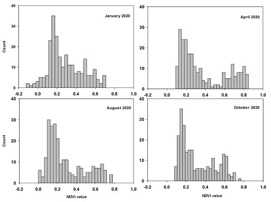 Histogram showing distributions of greenness from vegetation for four periods of 2020 in the High Atlas Mountains of Morocco. NDVI was calculated from Landsat 8 (USGS).