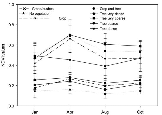 NDVI values were highest for April, whereby monocropped areas, crops mixed with trees, and very dense tree areas had the largest NDVI values during the greenest period, which confirmed the accuracy of our inventory. The SVM approach did not indicate distinct NDVI differences between Forest and Open Canopy Vegetation classes. As for Bareland, the NDVI of grass/bushes, very coarse trees, and coarse tree areas did not allow separation even between dry and rainy seasons (Figure 8).