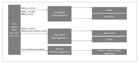 - Very low NDVI values that represented either Water or Bareland without vegetable cover especially during the dry season: NDVI < 0 represented Water, while ranges of 0 < NDVIJan <= 0.17 represented Bareland, equivalent to previous classifications. We used values in January and April that showed more consistent values than other seasons (Figure S2);