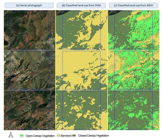 Comparison of (a) map derived from aerial photograph dataset tile in QGIS, (b) land-use classes from the SVM classification approach, (c) land-use classes from the NDVI rules-based classification approach in three validation windows (blue) of 5 km × 5 km in the High Atlas Mountains of Morocco.