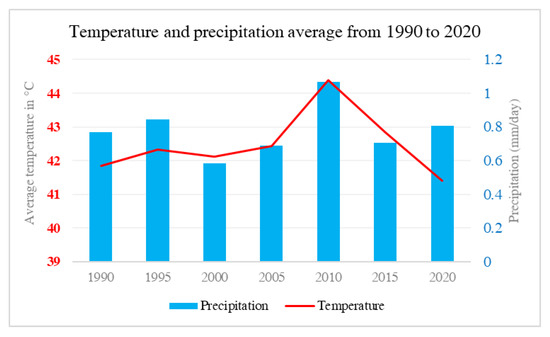 Temperature and precipitation average variation from 1990 to 2020 (https://power.larc.nasa.gov, accessed on 21 October 2022).