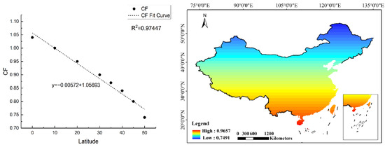 Since the CF value look-up table is discontinuous, this study fits the raster data with spatially continuous CF values by establishing a linear regression relationship between CF and latitude. January is taken as an example (Figure 2).