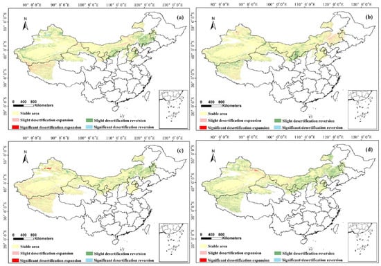 Changes in the degree of desertification from 2000 to 2020. (a) 2000–2005; (b) 2005–2010; (c) 2010–2015; (d) 2015–2020.