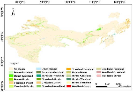 Land-use change is the process of regional land-use transformation from one form to another. We studied 2001 and 2020 using MODIS MCD12Q1 land-use data, which divides land types into 17 categories [52]. We merged the relevant categories and eventually simplified them into nine different land types for land-use change studies. We used the transfer matrix (Table S2) to measure dynamic information on land-use changes over time [53] and produced a map of land-use transfers (Figure 9). We found that from 2001–2020, the desert area was reduced by 117,919 km2, mostly converted to grassland. In addition, 12,583 km2 of farmland was converted to grassland. These conversions are mainly due to the Chinese government’s policy of returning farmland to forests and grasses after the year 2000 [54]; the project targets sloping arable land prone to soil erosion, arable land prone to land sanding, and arable land with low and unstable grain yields by planting them with forests and grasses according to local conditions. Thus acting as a sand fixation, effectively mitigating desertification in northern China.