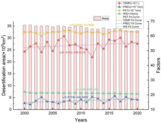 We mainly analyzed the average annual precipitation, average temperature, average potential evapotranspiration, and average wind speed in northern China to study the climatic drivers of desertification. In Figure 10, the year-to-year variation of various climatic factors in the study area is shown. We found that the fluctuations in temperature and potential evapotranspiration were generally consistent, but they did not seem to correlate well with desertification area. Precipitation and desertification area have some negative correlation, and in some years with low precipitation (2001, 2006, 2009, 2014, and 2020), desertification area is relatively larger. While the overall fluctuation of wind speed is not great, it can also be seen that wind speed has some positive correlation with desertification area, and in the years with higher wind speeds (2000, 2006, 2009, and 2016), desertification area is also relatively larger. However, we still need to conduct specific data analysis for the specific correlation.