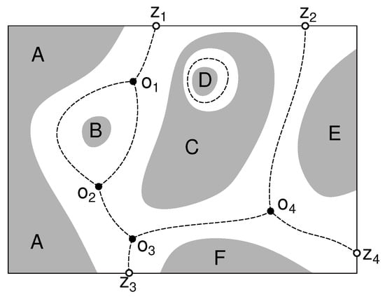 where refers to the location of a point outside and refers to a point within regions. With the rule, the phase outside of regions can be set, such as , and the areas outside (white areas in Figure 2) are divided and attached to their nearest regions. Phase connections between continuous regions depend on the phase at expanded boundaries. We denote the expanded boundary as l, shown as dashed lines in Figure 2.