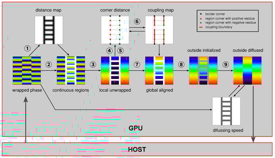 The proposed method was implemented by extracting continuous regions, unwrapping within these regions, aligning the regions, and growing the regions. To achieve computational efficiency, a GPU-based parallel processing scheme was designed for the main processing. In this parallel mode, massive local independent operations are carried out for each local grid point, corner, boundary, and surrounding neighborhood. The main process is briefly described as follows: