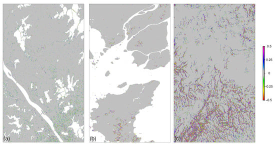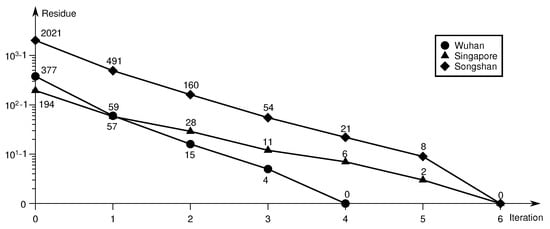 The three experimental interferograms were of pixels, pixels, and pixels, respectively. There were 72,751 positive and 73,183 negative, 13,178 positive and 13,151 negative, and 86,080 positive and 86,093 negative phase residues detected in the three interferograms, respectively (Figure 9a–c). The initial distance maps were constructed based on these positive and negative residues (Figure 9d–f), and the coupling of residue pairs was performed four times for each of the three datasets. This process resulted in 10,094 pairs being found and 79 positive and 11 negative phase residues remaining uncoupled in the Wuhan data, 14,895 pairs and 193 positive and 153 negative residues remaining uncoupled in the Singapore data, and 82,719 pairs and 3718 positive and 3690 negative residues remaining uncoupled in the Songshan data.