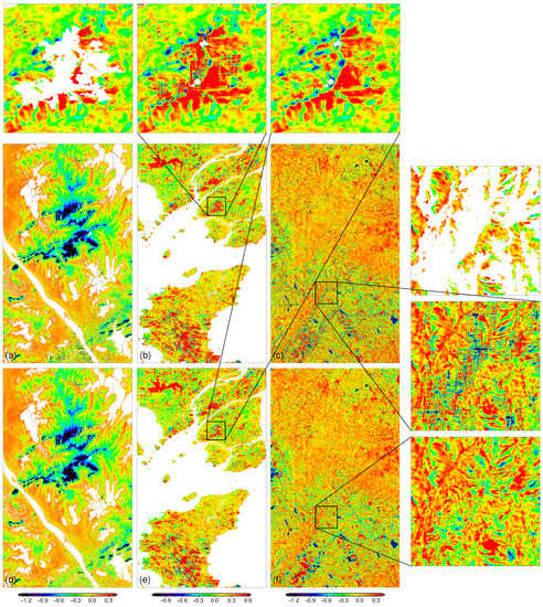 The initial unwrapped phase outside the continuous regions from PCR for Wuhan (a), Singapore (b), and Songshan (c) and their final version (d–f) with 1000 times of nonlinear diffusion, respectively. The detailed local unwrapped phase in the regions shows the unwrapped version and diffusion version of the areas marked.