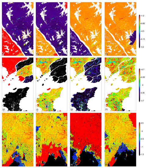 After aligning the regions for the global frame, Poisson solving with the Dirichlet boundary condition provided the initial unwrapped phase, considering the discontinuities defined in Equation (14). The initial solutions were obtained from four times of PCR iterative solving with wrapped phase differences along the horizontal and vertical directions. The three initial solutions were then subjected to 1000 iterations of nonlinear diffusion, respectively. Congruent areas were updated every 20 iterations with for the data of Wuhan, for the data of Singapore, and for the data of Songshan. The initial unwrapped phase from PCR solving and the final results from nonlinear diffusing are shown in Figure 13.