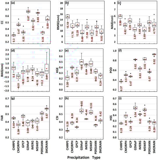 Boxplots of evaluation indices (a) CC, (b) RMSE, (c) MAE, (d) BIAS, (e) KGE, (f) POD, (g) FAR, (h) CSI, and (i) HSS for SPPs at grid scale from 2007 to 2020. The labelled red dot represents the mean value, and the black dots represent outliers.