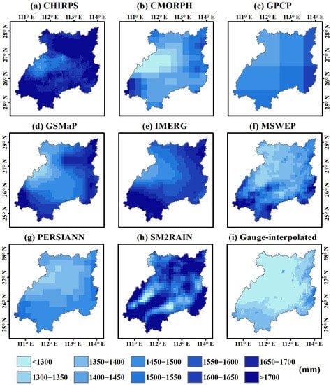 In order to explore the spatial variation of different SPPs, the spatial distribution map of annual average precipitation estimates (Figure 3) was generated by aggregating and averaging the daily precipitation estimates from 2007 to 2020.