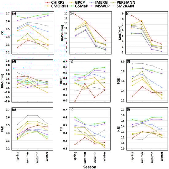 Seasonal (from 2007 to 2020) (a) CC, (b) RMSE, (c) MAE, (d) BIAS, (e) KGE, (f) POD, (g) FAR, (h) CSI, and (i) HSS at grid scale for the eight SPPs in XJRB. Different coloured dots and lines represent each precipitation product.