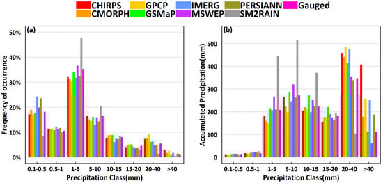 The frequency distribution of precipitation (a) and accumulated precipitation distribution annually (b) in XJRB from 2007 to 2020 for different precipitation datasets under different precipitation intensity classes.