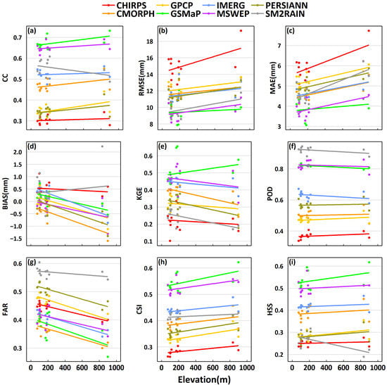 Relations between statistical metrics and elevation for CHIRPS, CMORPH, GPCP, GSMaP, IMERG, MSWEP, PERSIANN, and SM2RAIN at a gauge grid scale: (a) correlation coefficient (CC), (b) RMSE, (c) MAE, (d) BIAS, (e) KGE, (f) POD, (g) FAR, (h) CSI, and (i) HSS. The coloured lines depict the linear trends.