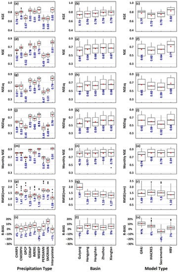 Boxplot of performance indicators (a–c) KGE, (d–f) NSE, (g–i) NSEsq, (j–l) NSElog, (m–o) Monthly NSE, (p–r) RMSE, (s–u) R-BIAS for hydrologic modelling driven by various precipitation inputs at five sub-basins in XJRB. The red dot represents the corresponding statistics’ average value (labelled in blue), and the black dots represent outliers.