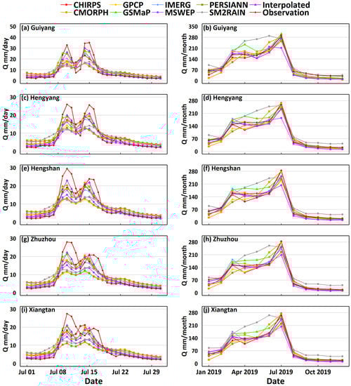 SPP performance during extreme events was assessed during flash flooding in July 2019 (Figure 8a,c,e,g,i). The best hydrologic modelling performance was shown by the benchmark (interpolated gauge observations), with a high KGE (0.71–0.81) and NSE (0.84–0.90). The GSMaP, IMERG, CMORPH, and CHIRPS performed well also. However, the MSWEP, SM2RAIN, PERSIANN, and GPCP performed relatively poorly compared to the other SPPs. Moreover, these models, especially those driven by the SPPs, tend to underestimate high flow and struggle to predict peak flows in flood events.