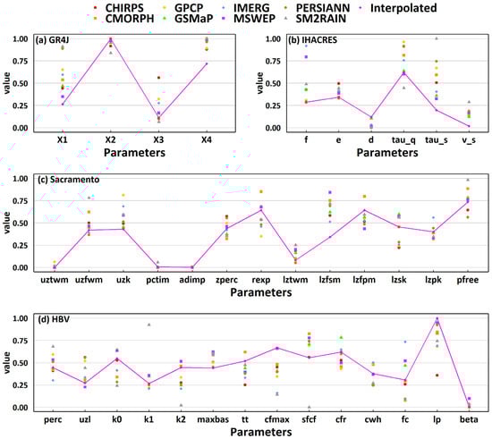 Distribution of normalized optimal hydrologic parameters with different precipitation inputs for the various hydrologic models. The optimal parameter combination for each calibrated hydrologic model driven by different precipitation products is represented with a different coloured mark. In addition, the optimal hydrologic parameters combination driven by the rain gauge observation interpolation are plotted with a magenta mark and line for reference.