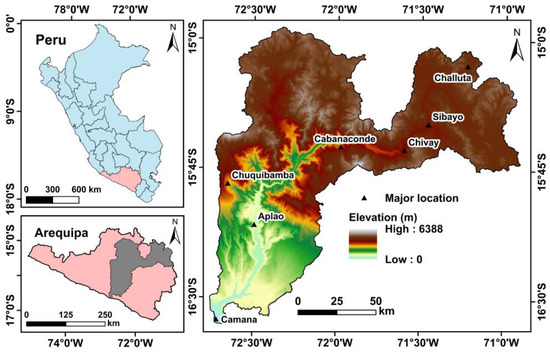 The study area covers the Colca-Camana watershed in the southern part of Peru with a spatial extent of 16,955 km2, which covers approximately 27% of the total area of the Arequipa region. The longitude and latitude of the study area are 72°45′29.45″W to 70°54′6.5″W and 14°55′48″S to 16°39′28.89″S, respectively. Figure 1 displays the geographical location of the study area. Arequipa is the second most important commercial hub of Peru and therefore plays a crucial role in the socio-economic development of the country. The study area was chosen for the LSM due to high landslide vulnerability, socio-economic importance, and the availability of suitable remote sensing and auxiliary datasets. The region is tectonically active, contains several major faults and volcanoes, and experiences frequent earthquakes. Faults are mainly oriented in the NW–SE direction.